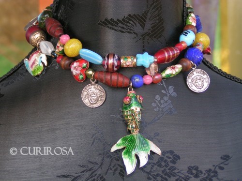 In deze choker zitten nog kralen van mijn oma, daarom ben ik nog steeds helemaal verslingerd aan dit sieraad. Ik hou vreselijk van allemaal kleurtjes. Supervrolijk toch? En de cloisonnekralen maken het geheel levendig.