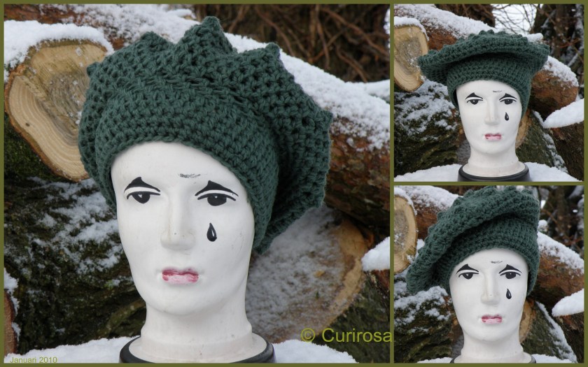 Het begon me ineens weer te kriebelen na al die sneeuwval van de laatste maand en ik ben in mijn voorraad wol gedoken (ik koop altijd van die zielige alleenstaande bollen wol in de Kringloopwinkel, waar je nooit meer een hele trui of een paar sokken uit kan halen, maar als je met restjes een muts of sjaal maakt, kan dat juist erg leuk zijn!) en gewoon maar begonnen. Nog wel met een haakboekje ernaast (ook uit de Kringloop) met allerlei techniekjes en tips. Maar voor de rest helemaal op mijn eigen gevoel. En dat is deze baret geworden: