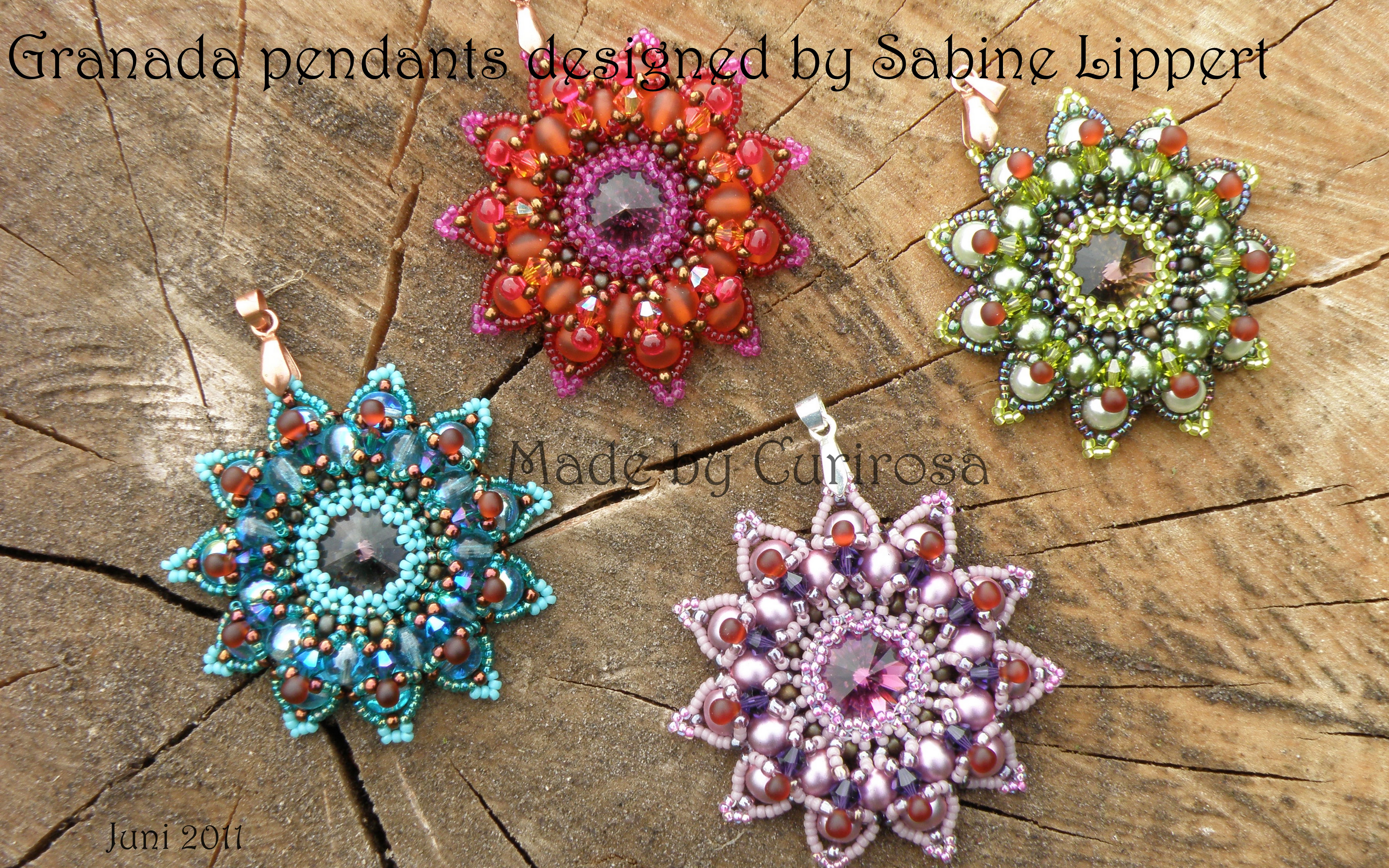 Overal op het internet naar het patroon gespeurd, maar niet gevonden. Toen heb ik het patroon ‘illegaal’ van een kralenvriendinnetje gekregen. Toen ik de eerste (de lila) had gemaakt, kreeg ik toch zo de smaak te pakken dat ik er meer gemaakt heb. Maar officieel moet je dat patroon bij de ontwerpster kopen…dus zou ik ze wel op mijn blog zetten? Ik kreeg gewetenswroeging en heb de ontwerpster Sabine Lippert maar een mailtje gestuurd. En wat blijkt? Ze heeft het patroon niet meer op haar site staan, omdat het in een boek komt wat volgend jaar verschijnt! Dus ik heb ook nog een scoop! Dus voor deze keer was het niet zo erg, maar in de toekomst gewoon keurig het patroon kopen!