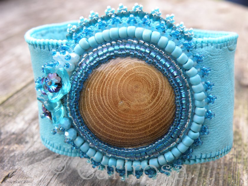 Ik ben nog bezig met 2 colliers, maar aangezien dat veel denk- en uitvogelwerk vergt, is dat niet iets wat ik makkelijk op een markt kan gaan zitten doen. Voor het publiek is het leuker om naar iemand te kijken die lekker met kraaltjes aan het borduren is, in plaats van iemand die steeds mopperend weer stukjes aan het uithalen is of constant zakjes met kraaltjes bij het ontwerp legt om te kijken of het kleurtechnisch wel klopt. Dus nu maar een eenvoudige turquois hanger, dit keer met goudkleur gecombineerd en aan een lange ketting: