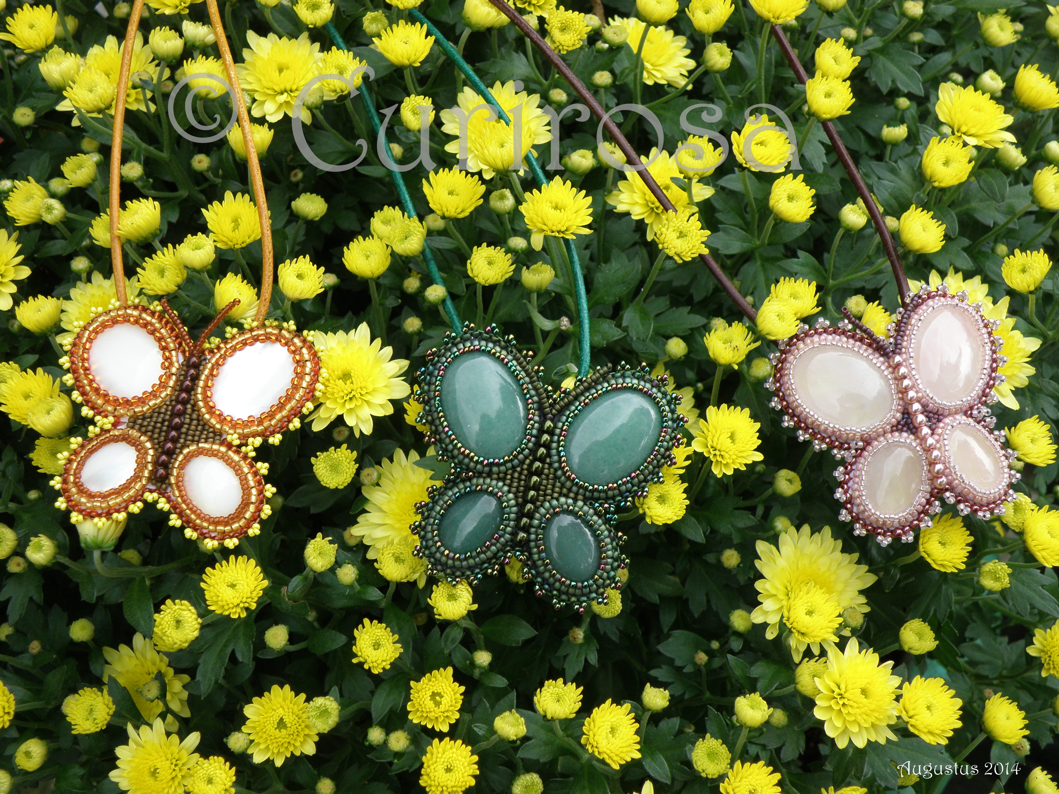 De linkse heeft parelmoer cabochonnetjes, de middelste is met aventurijn en de rechtse is gemaakt met rozekwarts. Ze zijn ongeveer 6cm breed en 5cm hoog. Gewoon aan een mooie leerveter en voila! Ik ben er zelf eigenlijk helemaal verliefd op geworden….