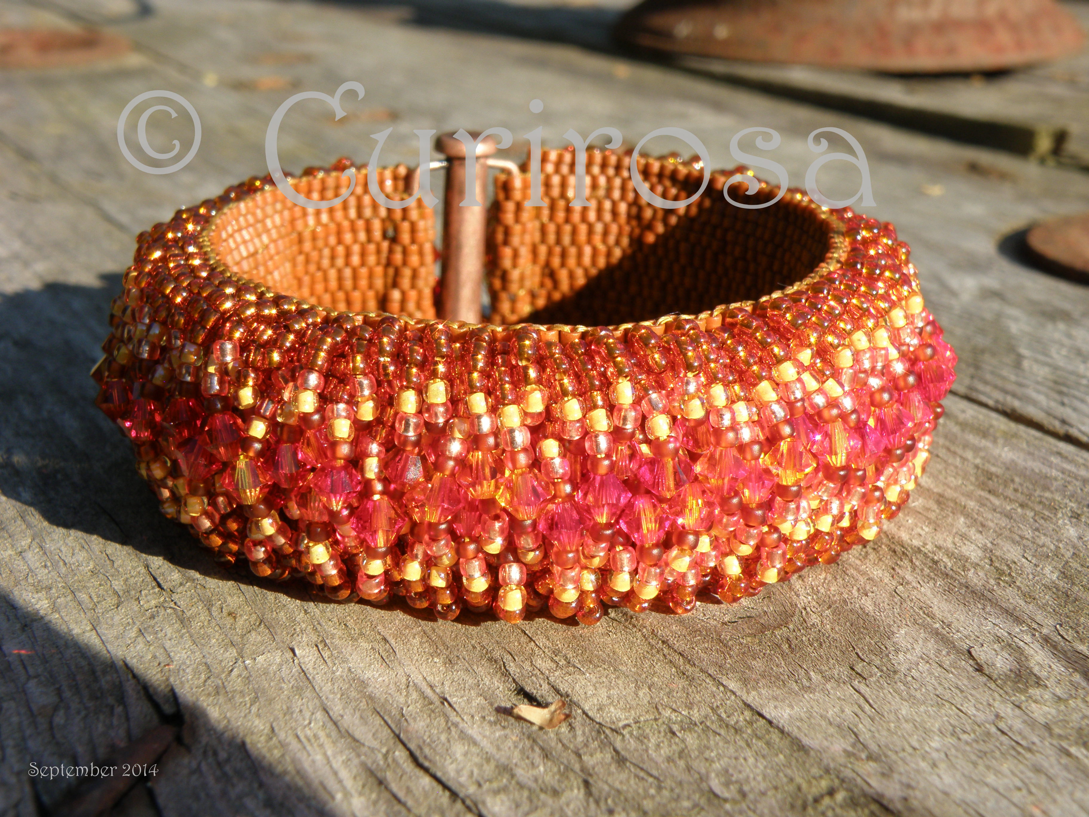 Ik heb deze armbanden (gebaseerd op een patroon wat ik al eerder in het paars/lila gemaakt heb uit de Bead and Button) al even klaar, maar had nog niet het moment gevonden voor de foto’s. Vandaag nog net op tijd aan gedacht. Ze krullen heel mooi op als je de sluiting losmaakt, ze lopen heel mooi rond en heten in het Engels Caterpillar cuff dus vandaar de rupsbandjes 😉 Ik wil meer sieraden gewoon weer lekker in het Nederlands gaan noemen. Hieronder achtereenvolgens Zilver, Turquoise en Oranje/bruin. Per armband zitten er rond de 200(!!) Swarovski bicones in, de foto’s kunnen de intense sprankeling van deze armbanden dus nauwelijks vastleggen.