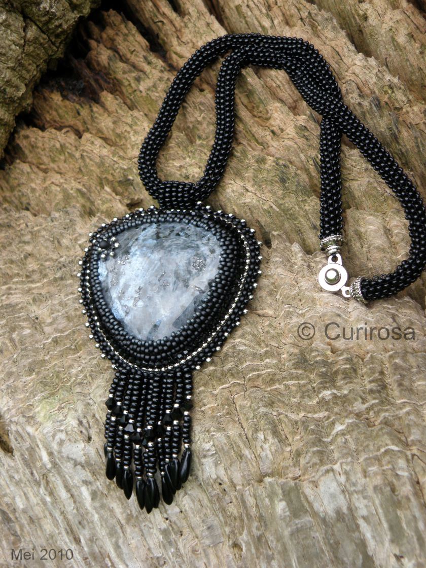 Beadwork, Jewelry, UncategorizedIk heb van beadworkvriendinnetje Marja eens een supergave Larvikiet cabochon gekregen en een paar dagen geleden lag ie ineens mijn naam te roepen vanuit een lade in mijn kralenkast, dus met een beetje aandacht en inzet is er dit collier uit gekomen: