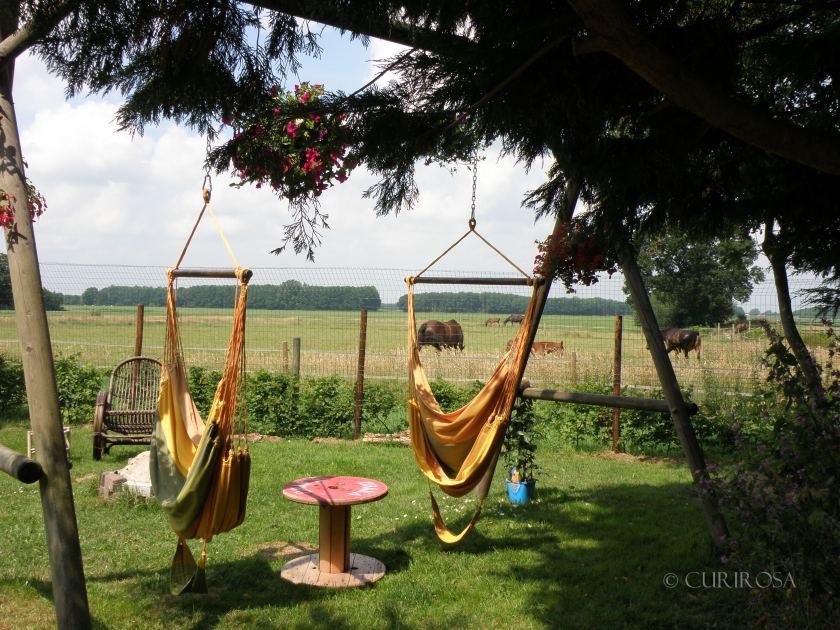 Ons zitje is meer een hangertje. Ik ben altijd jaloers geweest op onze poezen als ik ze in hun hangmandjes aan de verwarming zag hangen, wat leek me dat heerlijk…nu hebben wij een soort mensenvariant en wat is dat genieten na een lange dag werken. Je moet echt uitkijken dat je niet gaat zitten dutten…en dat uitzicht…WAUW! Dat is nog elke dag genieten.