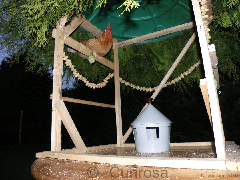 Hij eet lekker van het vogelvoer en van het brood, bakje water erbij, overdags scharrelt ie wat door de tuin en als het gaat schemeren klimt ie weer naar boven.