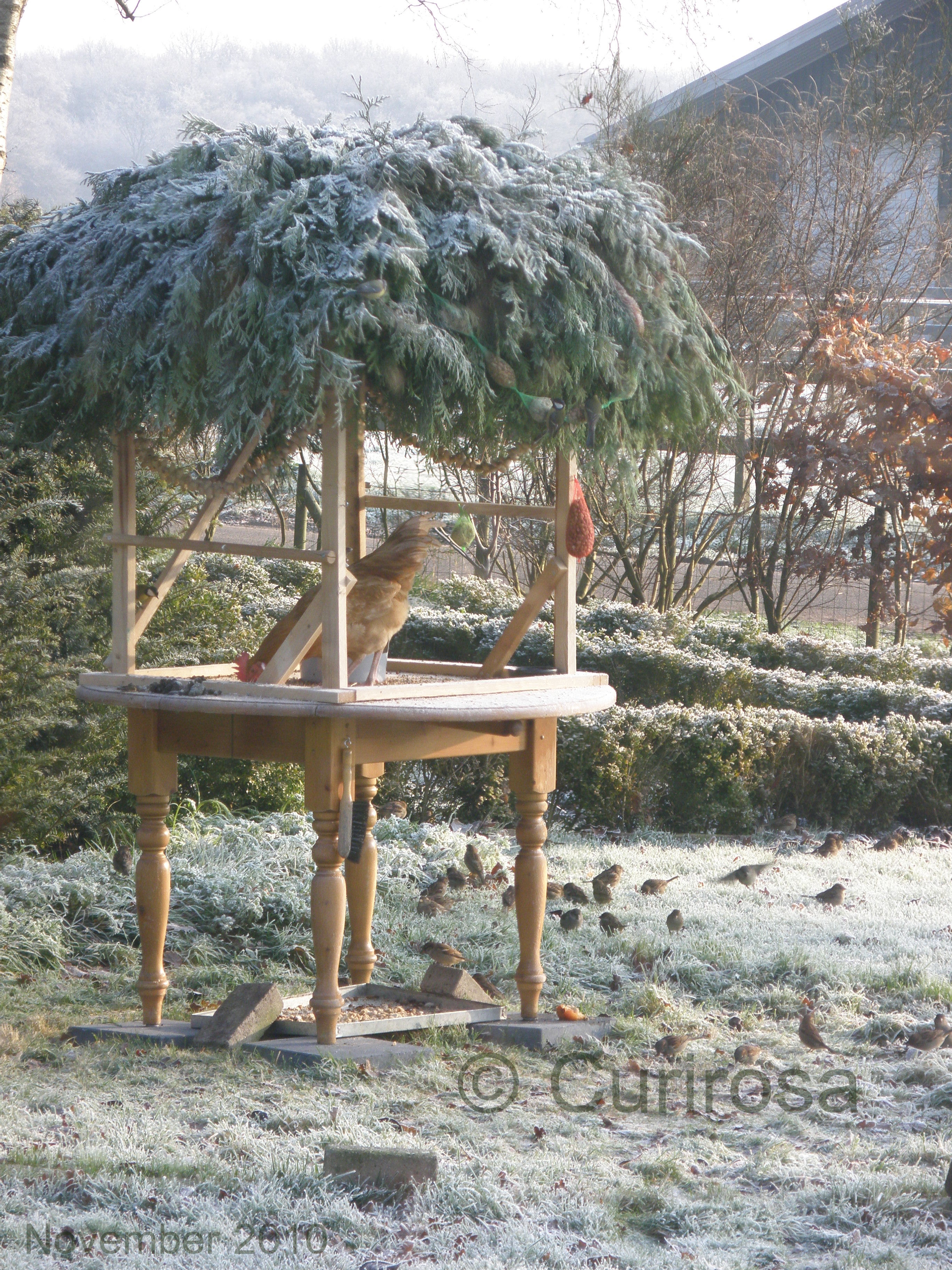 Nu wilde ik niet te lang wachten en heb ik via Markplaats een gratis ronde tafel bemachtigd, als basis. Daarop heb ik een frame gemaakt en als dakje het deksel van zo’n schildpadzandbak (die we hier als waterbak in de kattenren hebben staan) erop bevestigd met kippengaas erover. Daar heb ik allemaal coniferengroen in gestoken, al met al een pittoreske voederplek, al zeg ik het zelf. Doel is nog wel om een volgende mooier te maken, maar voor deze winter staat ie prima.