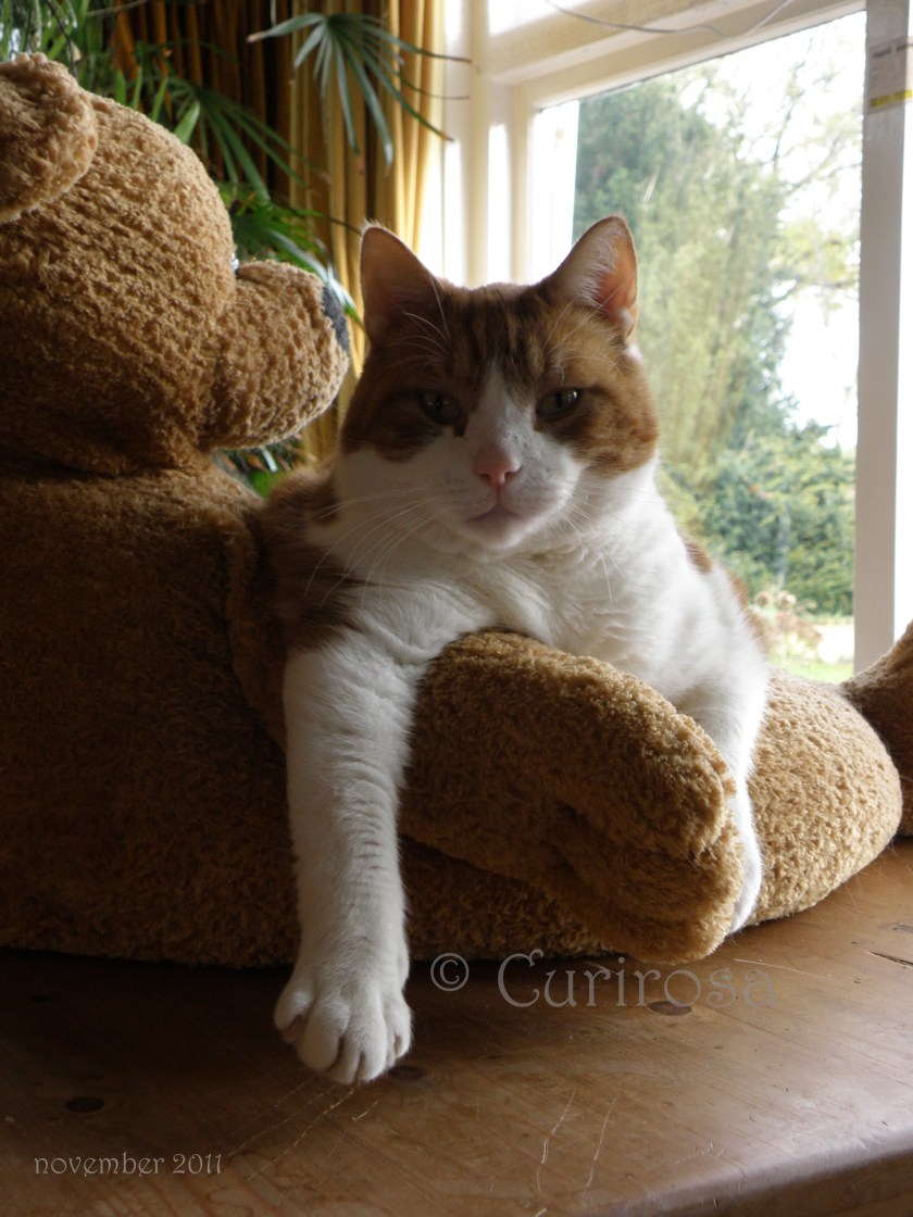 Animals, House & Garden, UncategorizedZie hier onze grote rode kater Druif…een ietwat angstige macho, die graag de leiding heeft en dit op slinkse wijze en veel meppen probeert te bereiken…alleen nu even niet! Lekker op de teddybeer! Deze hebben we een tijd terug bij een kringloop gekocht en is eigenlijk altijd wel bezet met een of meer poezen.