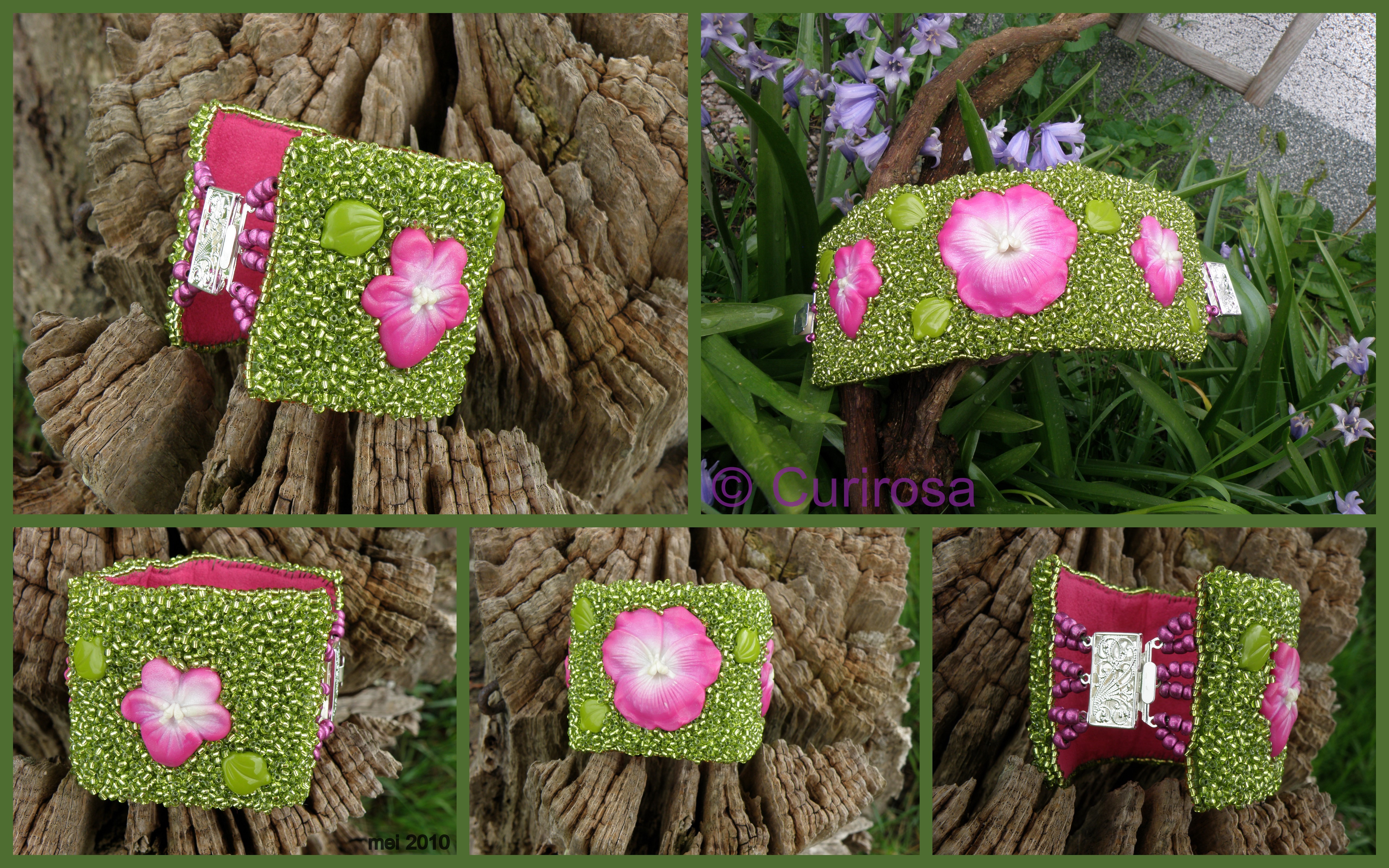 Beadwork, Jewelry, Polymer clay, UncategorizedNaar aanleiding van de challenge op het Kleiforum van the girls next door, Saskia en Marjon fimogirls.blogspot.com even flink mijn best gedaan om deze creatie vandaag af te krijgen. En het is gelukt, de viooltjes zijn van klei en door mijzelf gemaakt. Verder zitten er rocailles en een slotje van Eeks in/aan en ik heb de binnenzijde bekleed met roze ultrasuede van Black Crow. Is dit lente of niet?