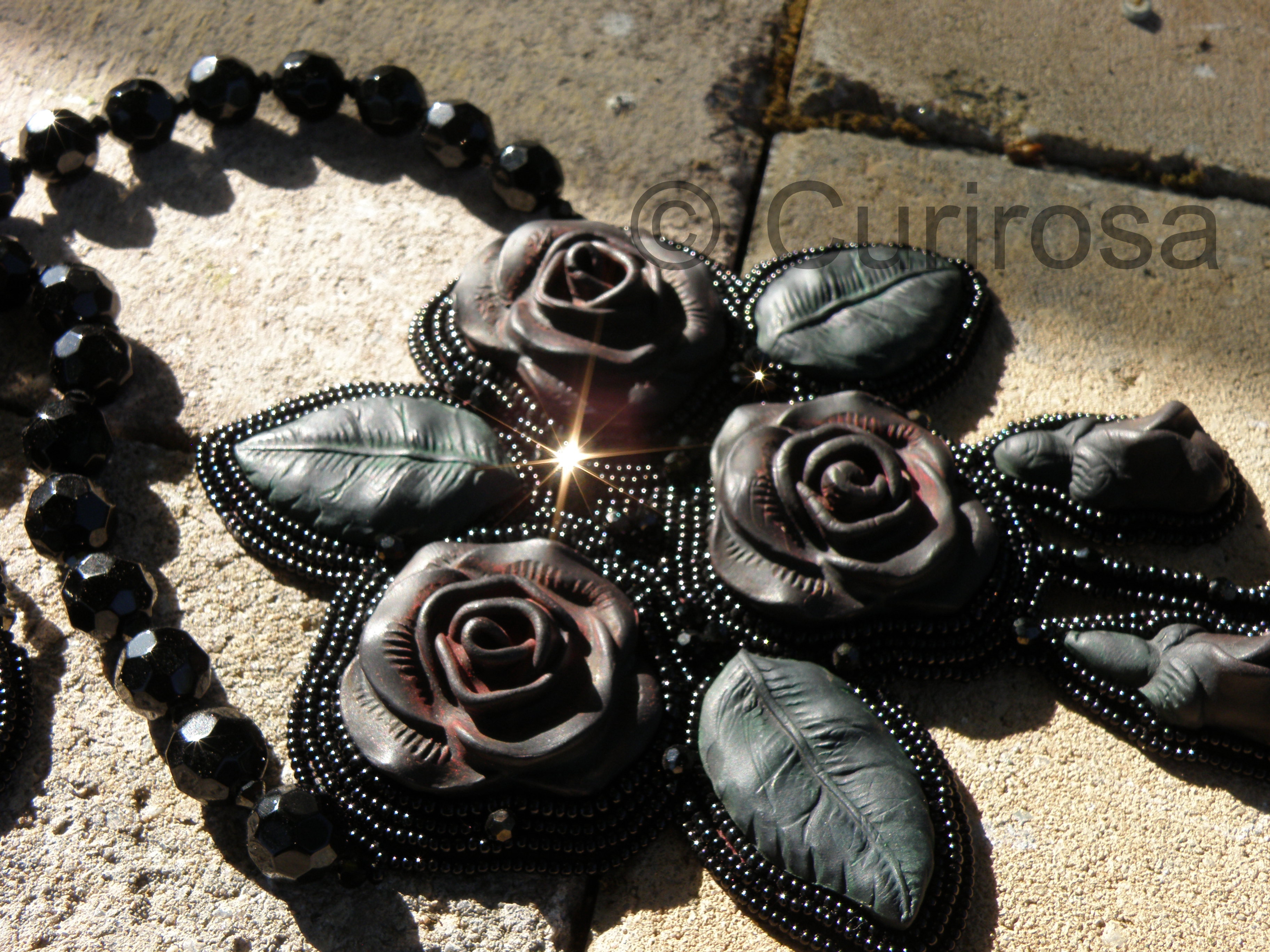 Deze choker heb ik ingestuurd voor de wedstrijd op het Beadworkforum, helaas is ie niet in de prijzen gevallen en is het ook niet helemaal mijn ding om te dragen, maar misschien dient zich nog een halsje aan waar ie heel mooi om kan vallen….jeweetmaarnooit! De rozencabochons en bladeren zijn ook zelfgemaakt van zwarte polymeerklei en heb ik met olieverf een kleurlaagje gegeven.